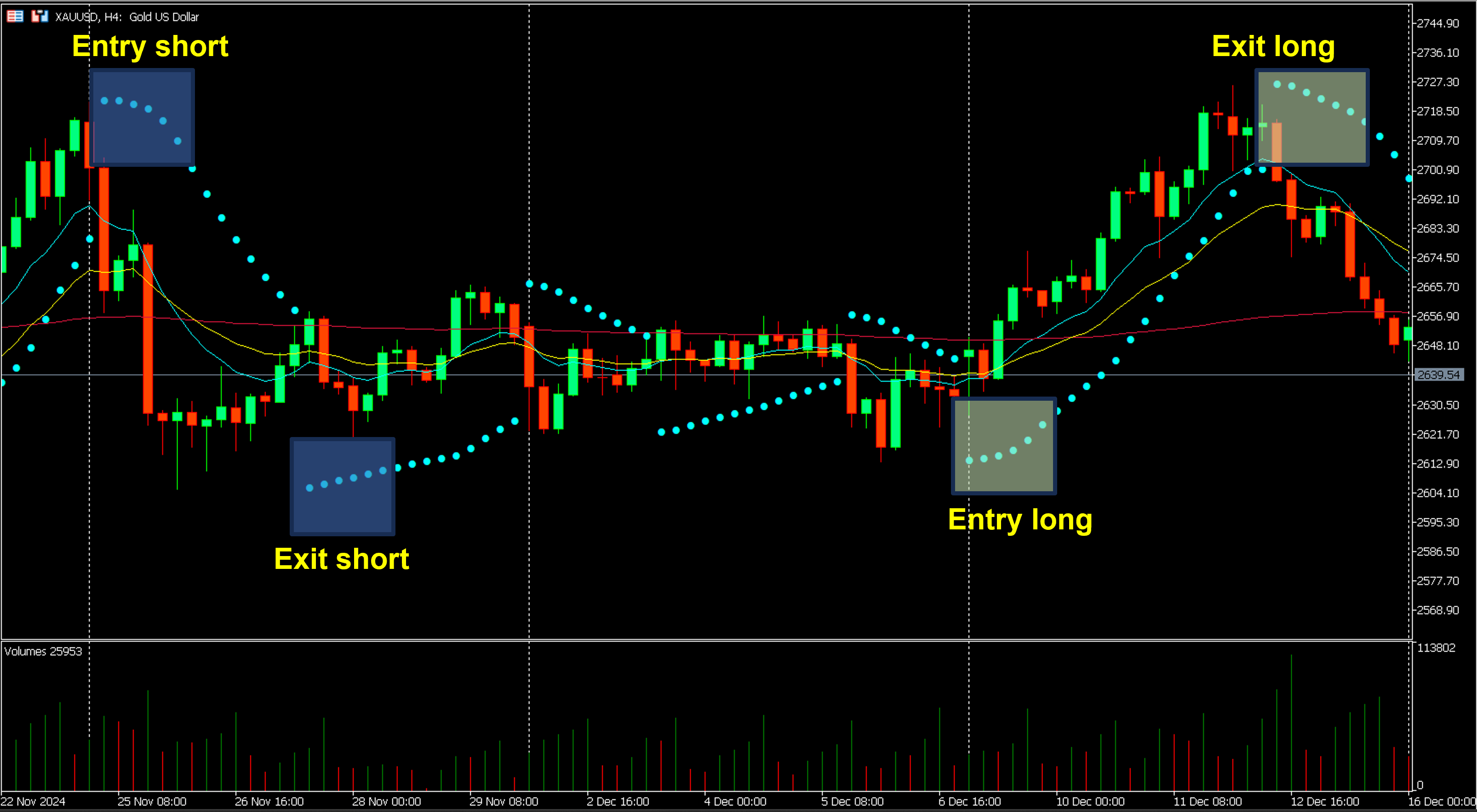 The chart example below (4-hourly gold CFD) shows the basic concept of SAR dot entry and exit for long and short trades respectively.