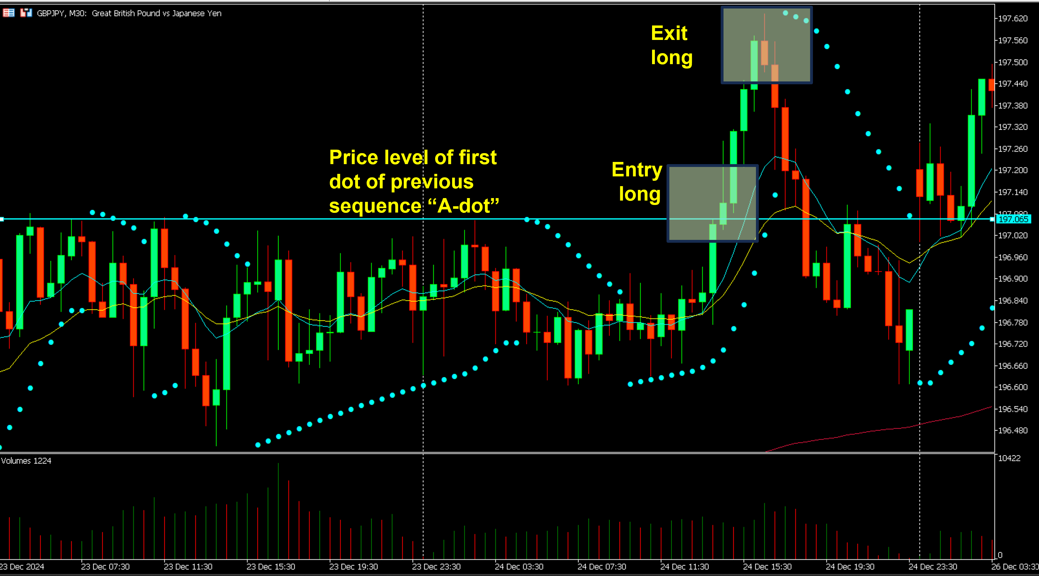 Ultimately, and as a sign that a trend may be ending, the dots change from below to above and vice versa depending on trend direction.