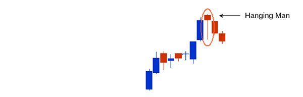 A Hanging Man is a bearish reversal pattern. Its formation is similar to the hammer formation, except that it occurs at the end of a bullish trend. Once again the body is at the top of the range with the lower wick at least twice as long as the body. The upper wick should be short if it can be found at all. It is best to seek confirmation of a bearish reversal with a follow-up signal the next day.