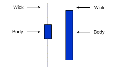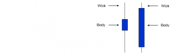 The thin lines above and below the body are called ‘wicks’ and represent the high and low range of the price for the day. The wick on top of the body represents sellers and selling activity. The bottom wick indicates the presence of buyers and buying activity. The length of the wick gives a good indication of the strength of the type of activity i.e. a longer wick is more definitive than a shorter one.