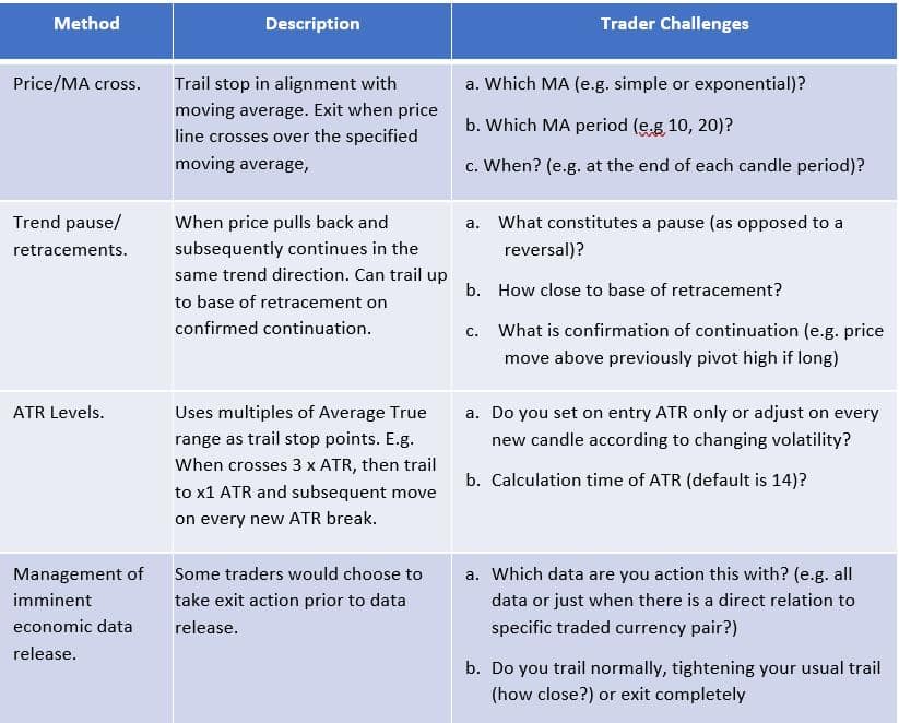 Below are some commonly used trading scenarios for trailing a stop, relevant challenges faced when attempting to be appropriately specific within your plan are below.
