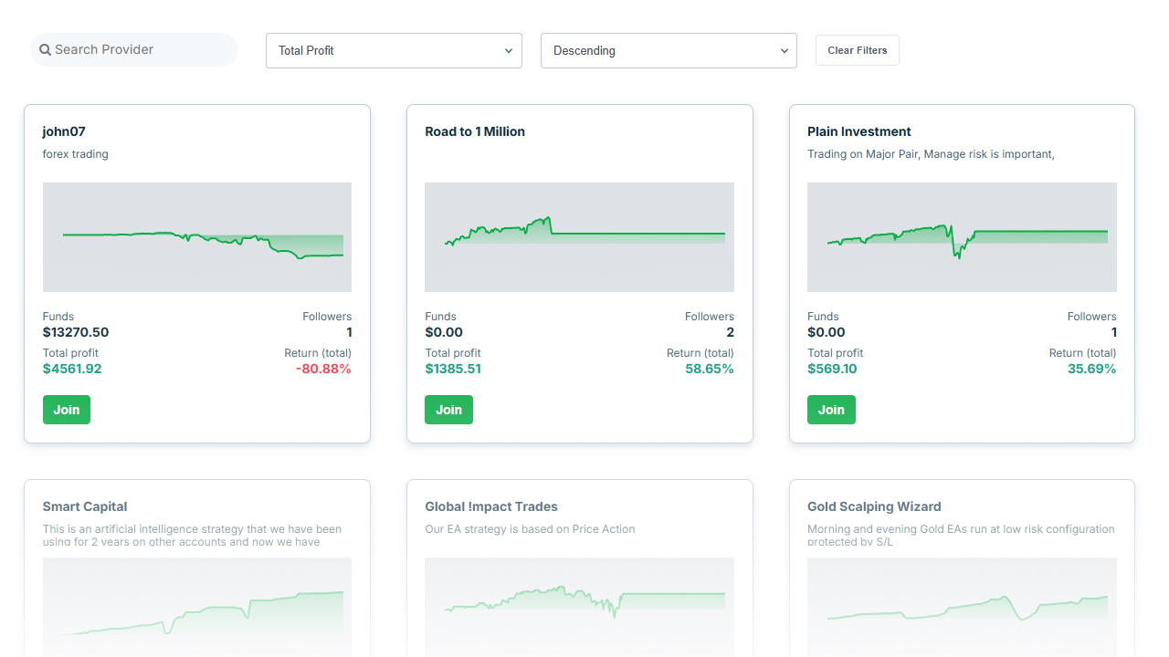 Browse a list of experienced traders within the community. Each provider has a performance history and trading style to help you make an informed decision.