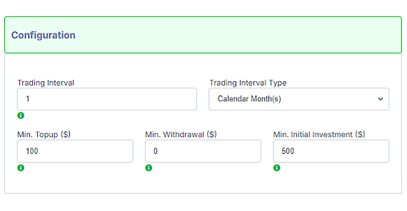 Money Managers can create offers for Investors, with configurable options such as trading intervals, minimum investment, performance/management fees and commission.